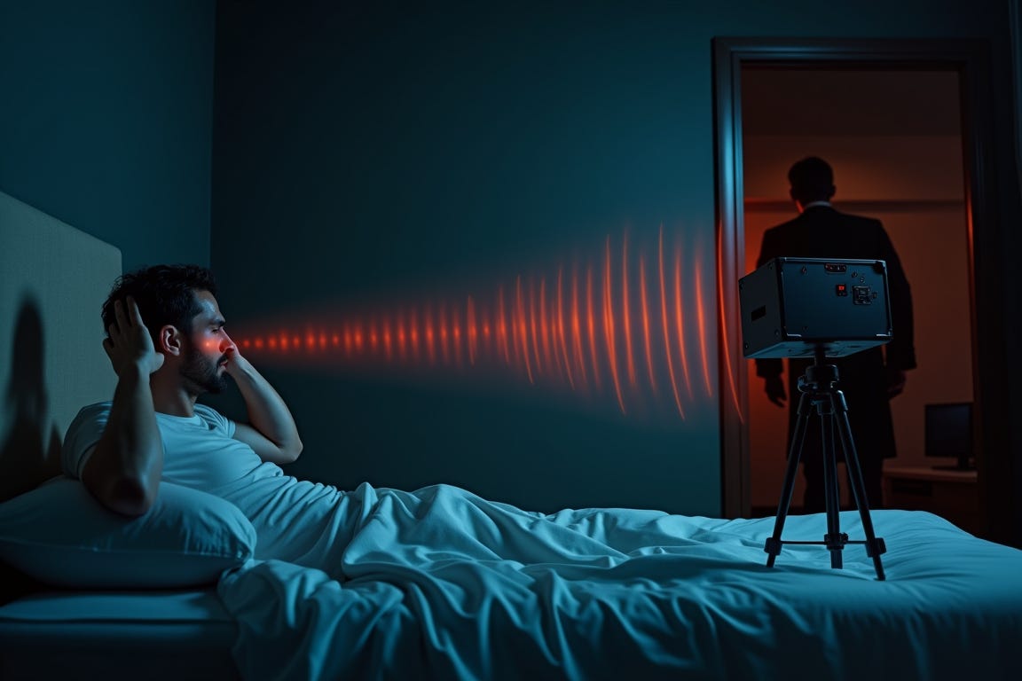 Unsere vertraulichen Quellen berichten, dass die noch immer als geheim eingestufte Waffe seit über einem Jahr in einem Labor des US-Militärs getestet wird. Versuche an Ratten und Schafen zeigen Verletzungen, die mit denen bei Menschen übereinstimmen. Außerdem wurden im Rahmen eines separaten Teils der Ermittlungen Aufnahmen von Überwachungskameras gesammelt, die zeigen, wie Amerikaner getroffen werden. Die Videos sind geheim, wurden uns jedoch beschrieben. In einem davon hat eine Kamera in einem Restaurant in Istanbul zwei FBI-Agenten im Urlaub gefilmt, die mit ihren Familien an einem Tisch saßen. Ein Mann mit einem Rucksack kommt herein, und plötzlich greifen sich alle am Tisch an den Kopf, als hätten sie Schmerzen. Unsere Quellen sagen, ein weiteres Video stamme aus einem Treppenhaus der US-Botschaft in Wien. Die Treppe führt zu einer gesicherten Einrichtung. In dem Video brechen zwei Personen auf der Treppe plötzlich zusammen.